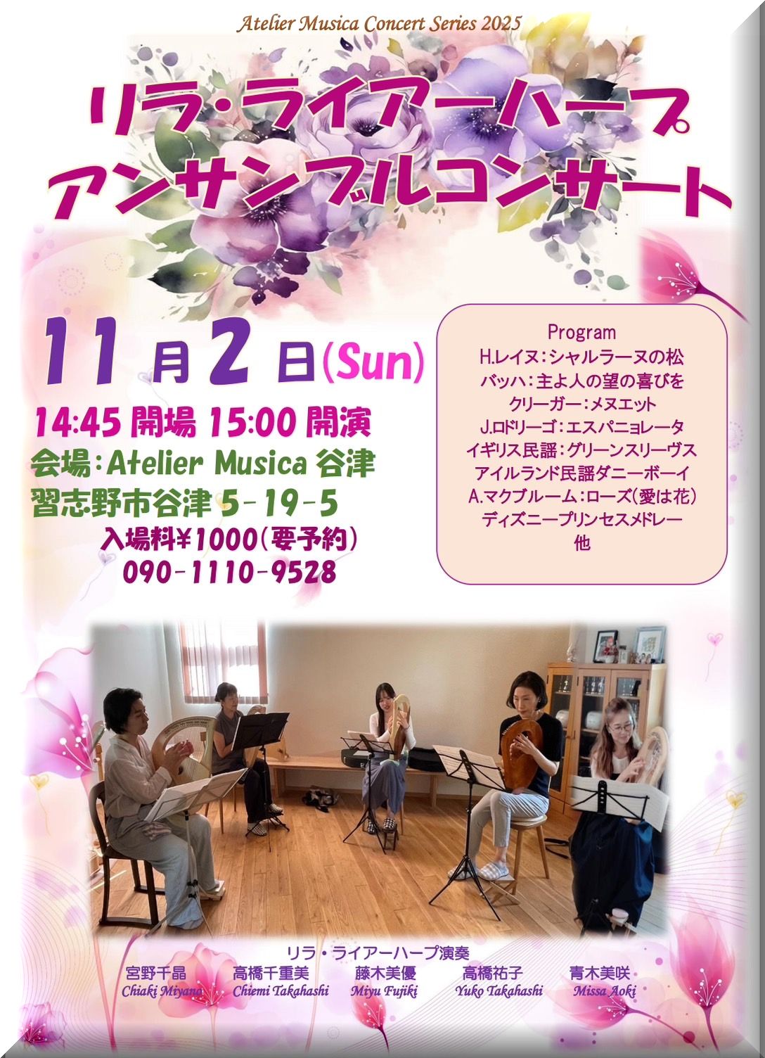 ドイツ留学中にシュタイナー教育の現場見学でリラハープに魅せられ、その後リラ製作者の松浦誠氏(リラ工房松浦楽器)に師事し、その魅力を伝える活動を開始しました。