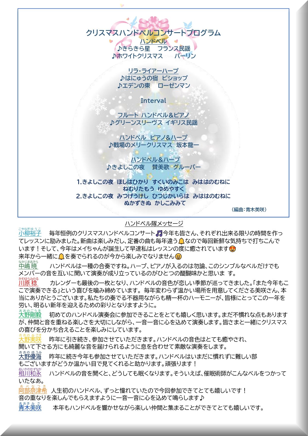 出演:ハンドベル 小柳裕子 中嶋暁 川原稔 大野剛毅 大野実咲 大野優海 相川和永 阿部奈津希 青木美咲