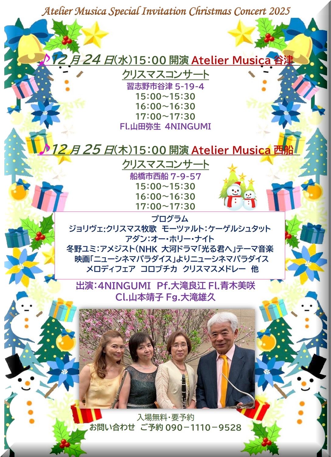 ・2015年12月20日(日) ◆クリスマスコンサート&パーティ 出演:4NINGUMI 会場:ふるさと村シランクスホール